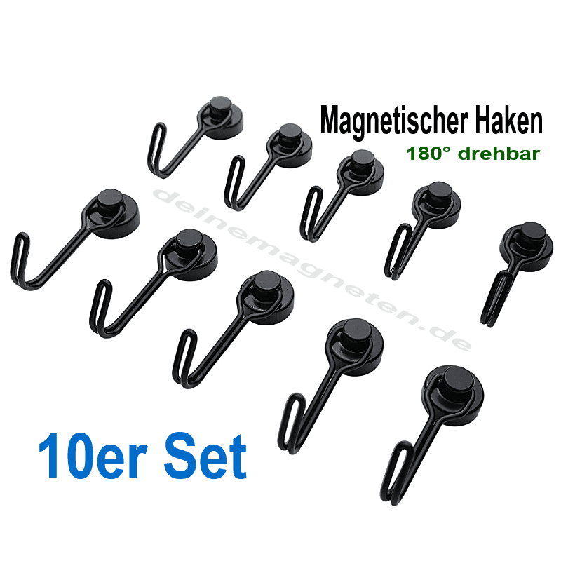 Magnetischer Haken 16mm (schwarz) – drehbar 180°, Neodym im Topf (10-Stück-Set)