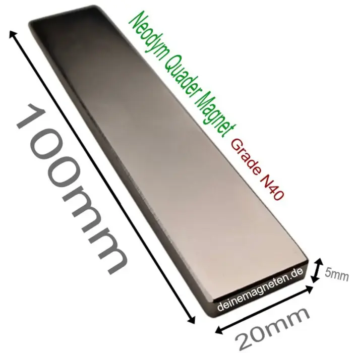 Bei diesem Magneten handelt es sich um einen Neodym (NdFeB) Quadermagneten in den Abmessungen 100 Millimeter in der Länge, 20 Millimeter in der Breite und 5 Millimeter in der Höhe. Magnetisiert ist dieser Starkmagnet mit der Grade N40.