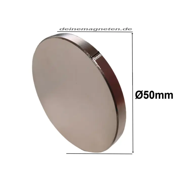 Bei diesem Scheiben-Magneten handelt es sich um einen NdFeB Neodym Rundmagneten mit einem Durchmesser von 50 Millimeter und einer Höhe von 5 Millimeter. Die Magnetisierungsstärke bei diesem vernickelten Permenentmagneten N45.