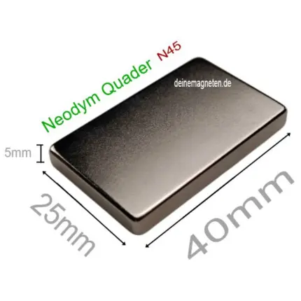 Neodym Quader 40x25x5mm Magnet N45, Block, NiCuNi, max °80