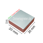 Neodym Quader- Block Magnet in den Abmessungen 20mm Länge & Breite und 10mm Höhe/Dicke mit einer dreifach-Beschichtung Nickel-Kupfer-Nickel.